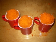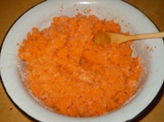 Užpilate tuo cuktumi tarkuotas morkas ir paliekate ramybėje kokiam pusvalandžiui. Tuo metu tirps cukrus, o morkos išskirs sultis.