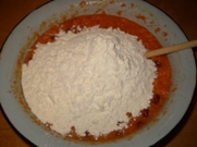 2,5 puodelio miltų ir kepimo miltelius verčiate į tešlą.